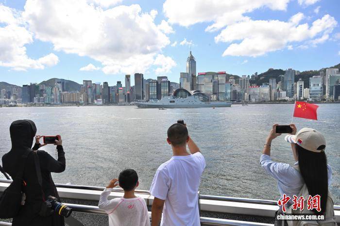 10月3日,海军戚继光舰、沂蒙山舰编队完成出航前的各项准备工作,驶离香港海域,前往柬埔寨、泰国、新加坡三国。尖沙咀码头有民众送别海军戚继光舰、沂蒙山舰编队。图为民众在尖沙咀码头拍摄海军沂蒙山舰。 中新社记者 李志华 摄
